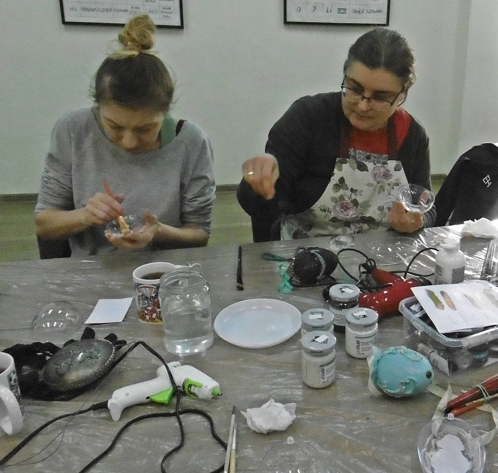 Jaja były akrylowe, dostarczone przez Elę z pracowni Kreasfera, media zapewniła nasza koleżanka Dobrosława, która też zaznajomiła nas z tajnikami tej techniki.
